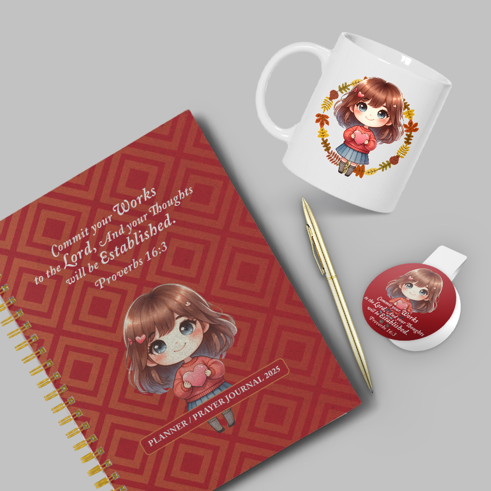 Get ready to conquer your day with the Red Square Geometric Planner/Prayer Journal Bundle Set! The hard cover 104-page planner and prayer journal will help you stay organized and grounded, while the included 11oz. mug, magnetic bookmark, and golden pen add a touch of style to your routine. Sip your coffee, jot down your thoughts, and feel empowered with Grace & Fire Designz.